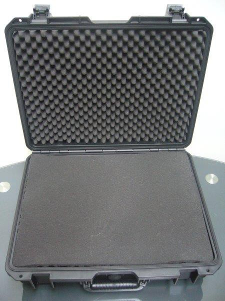 Rugged, lightweight flight case with foam inserts: 570mm x 425mm x 215mm (external). Water resistant rubber lid seal, pressure valve, lockable cliplocks, metal hinges. NEW