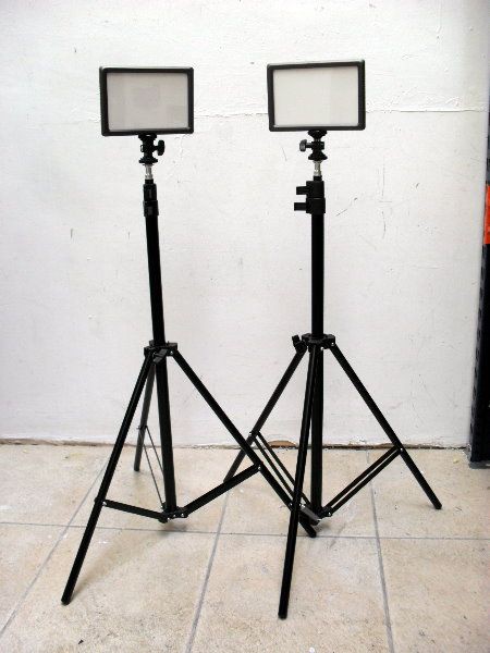 2 x Led Light Panels. EX DEMO 2 x 112 Led panels, adjustable light temp: 5600k to 3200k, Brightness Adjustment, Power source; takes NP-f and NP-FM series batteries, 2 x 2.1m tripod stands.