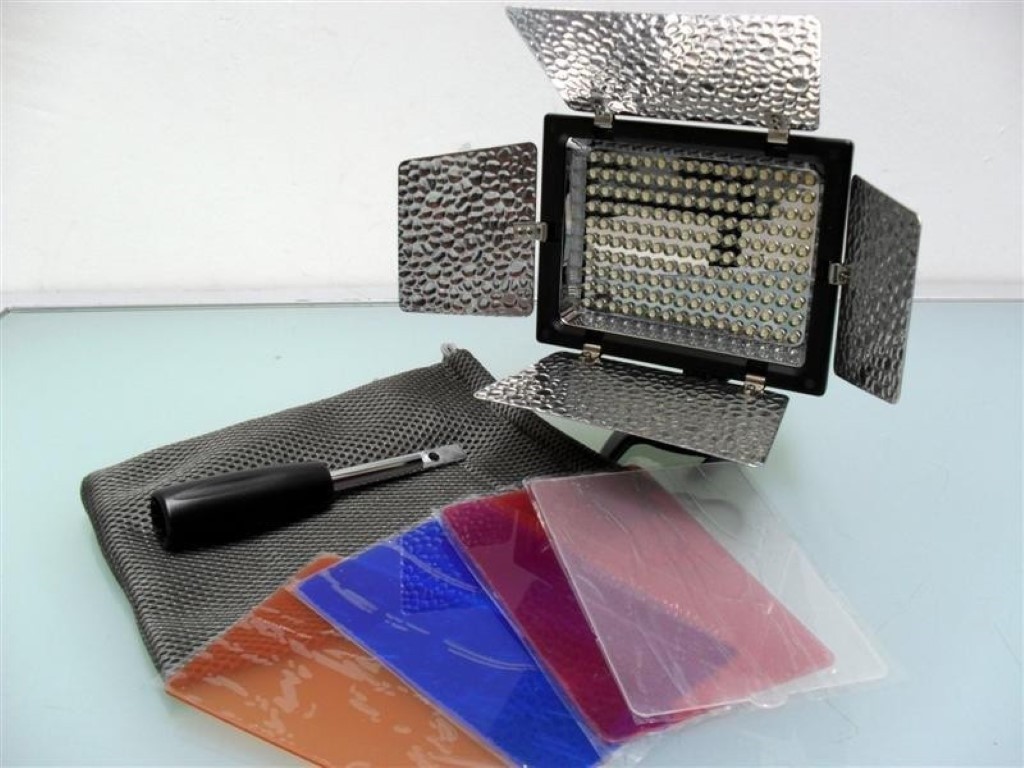 160 LED Pro camera top light with 16 brightness settings. Includes red, blue,orange filters, diffuser, handgrip, hot shoe adapter. NEW