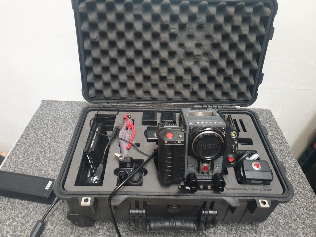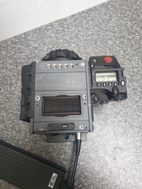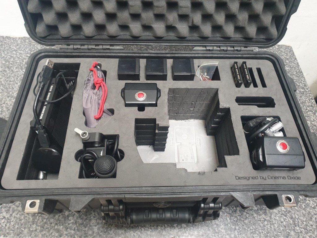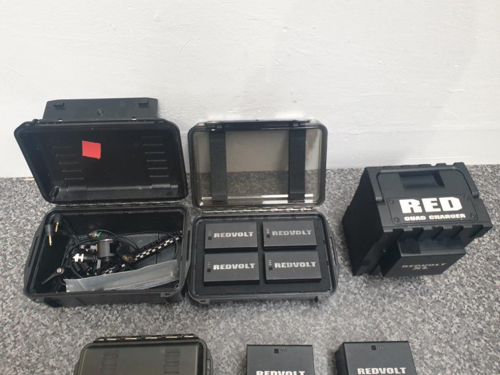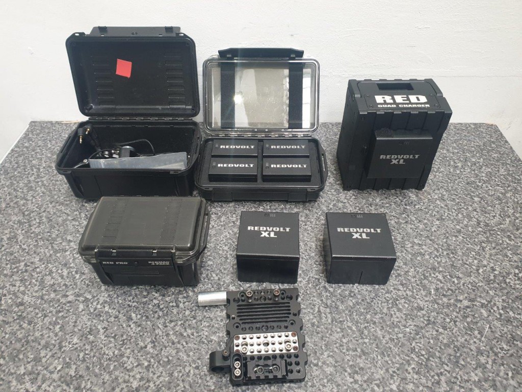 RED Scarlet kit: camera body with 4x brick batteries, 7x small batteries for the handle, 2x 64GB cards, cheeses plates, RED battery plate for the RED bricks (in a black RED box), 2x 15mm RED rods, 5in RED touchscreen monitor, extra cables for monitor, RED plastic box with some spare cables, red plastic box for RED MAGs, in custom PELI case specific for the RED scarlet