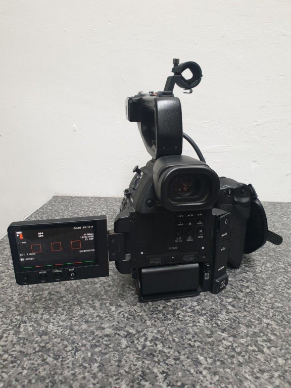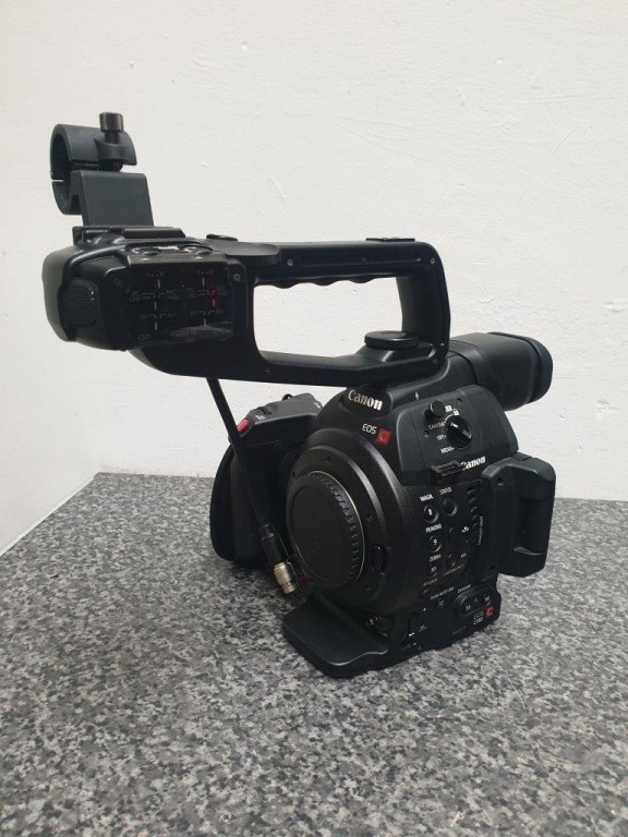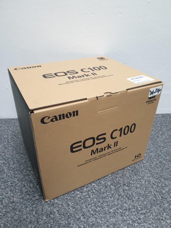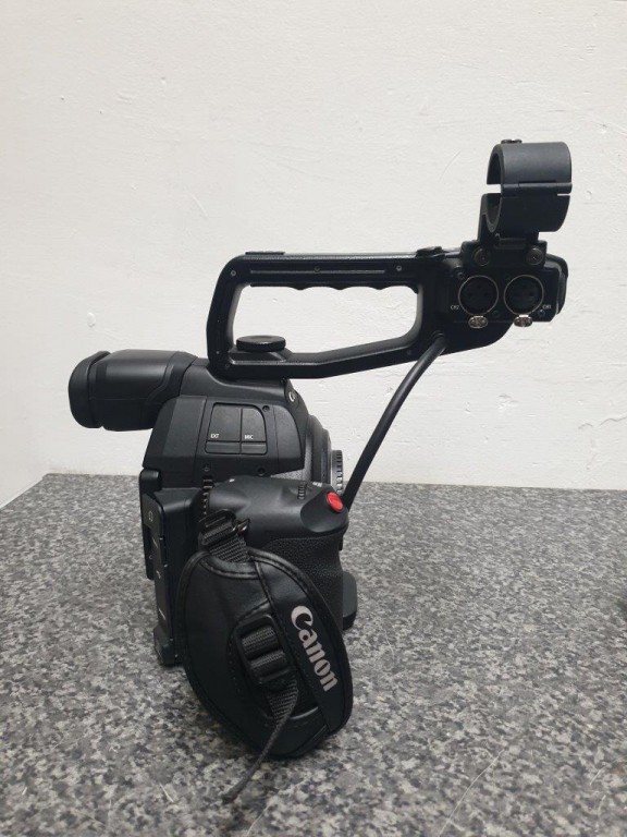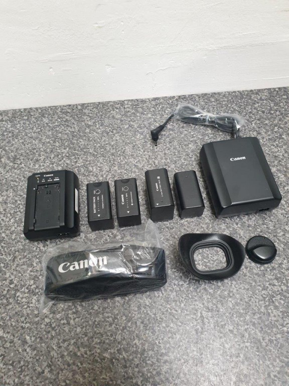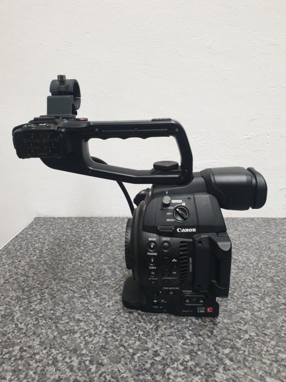 Canon C100 MkII kit: camera body with side grip, top handle, Canon brick to power via DC, 4 batts