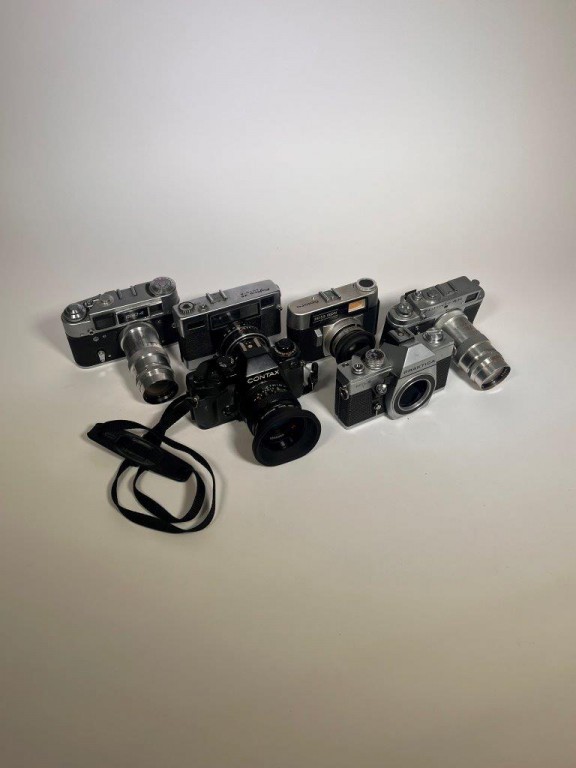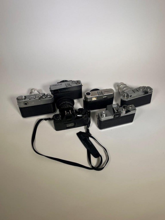 Zorki- 4k Camera with Jupiter 11 f4/135MM Vintage russian m39 Tele Photo Lens - FEDFDE4 Camera with Jupiter 11 f4/135MM Vintage russian m39 Tele Photo Lens - Contax Zeiss Camera with a Carl Zeiss 50mm f:1.7 Lens - Fujica 35 auto-M Camera with a Fujinon 35mm f:2.8 Lens - Praktica MTL (no lens) - Zeiss Ikon Colora Camera with a Ziess Ikon 2.8/50 Lens