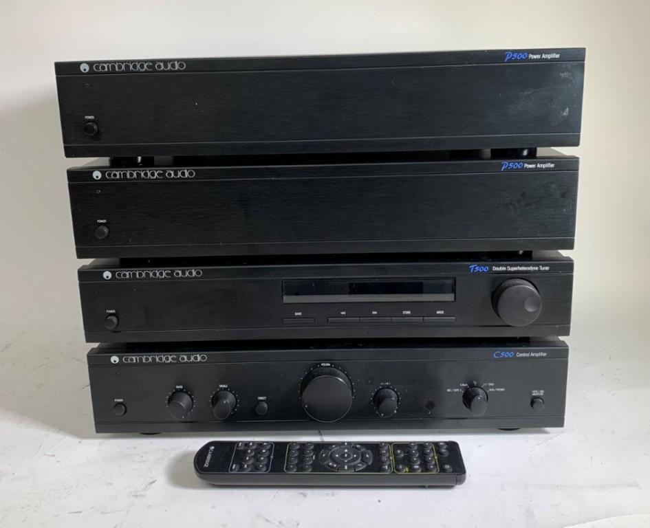 Cambridge Audio Stereo System with 2x P500 Power Amplifiers 1x T500 Double Superheterodyne Tuner 1x C500 Control Amplifier and 1x Hi-Fi Remote Control