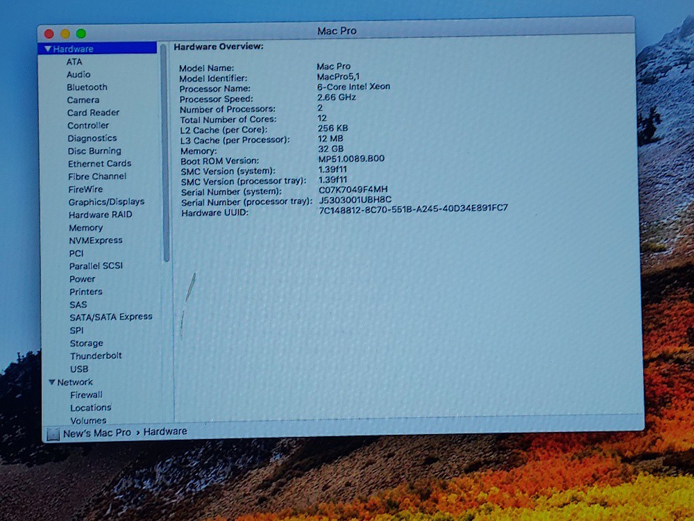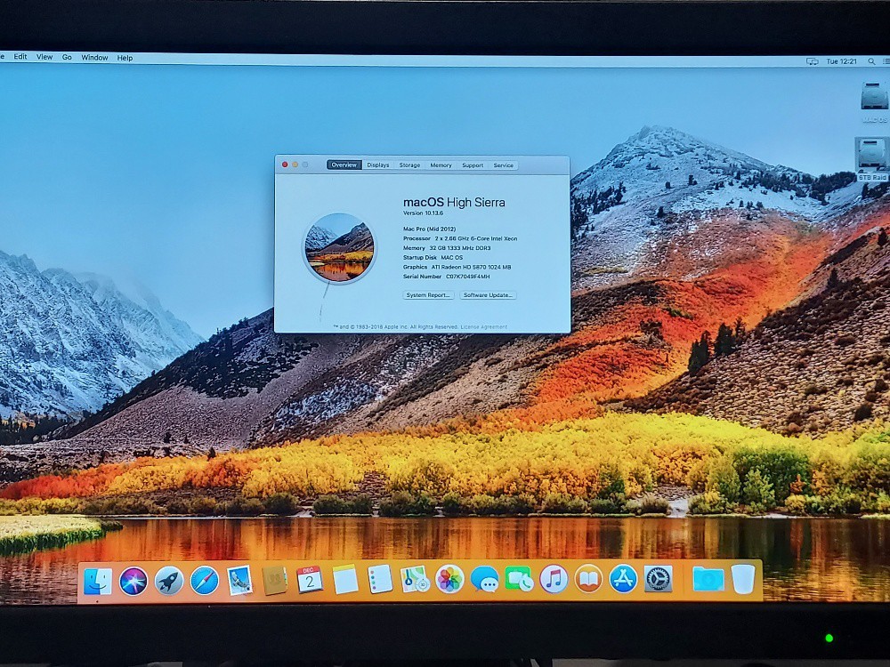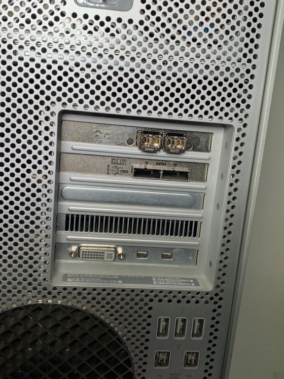 Apple Mac Pro 5.1 A1289 - 2x 2.66GHz 6 Core - 1TB system drive, 6TB Raid - 32GB RAM 1333MHz - ATI Radeon HD 5870 1029MB GPU - OS High Sierra- ATTO ExpressSAS H680 ExpressSAS Host Adapter - L3-25077-00G LSI 2-Port 4GB FC Controller Card with 2x Finistar 4GBps SFP's